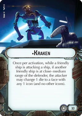 The goal of this fleet it to form a loose blob and focus one target down at a time. QBT means you want to stay pretty slow so you are getting the extra dice and enabling you to maximize ICB on every shot that meets Kraken's conditions. After a single salvo most ships will be very depleted on shields and definitely out of tokens. Slicer tools is there to stop an escape attempt or emergency repairs but is not a high priority. Otherwise the Hardcell can be an excellent Kraken setup and some light carrier operations if you don't need to activate the entire wing with HSB. Vultures are mainly a screen element that can provide some swingy damage in a pinch to enemy ships, but really they should be taking out enemy bombers if they can. Objectives here either help you blow up ships or force your opponent to engage with you meaning you can play more defensively.